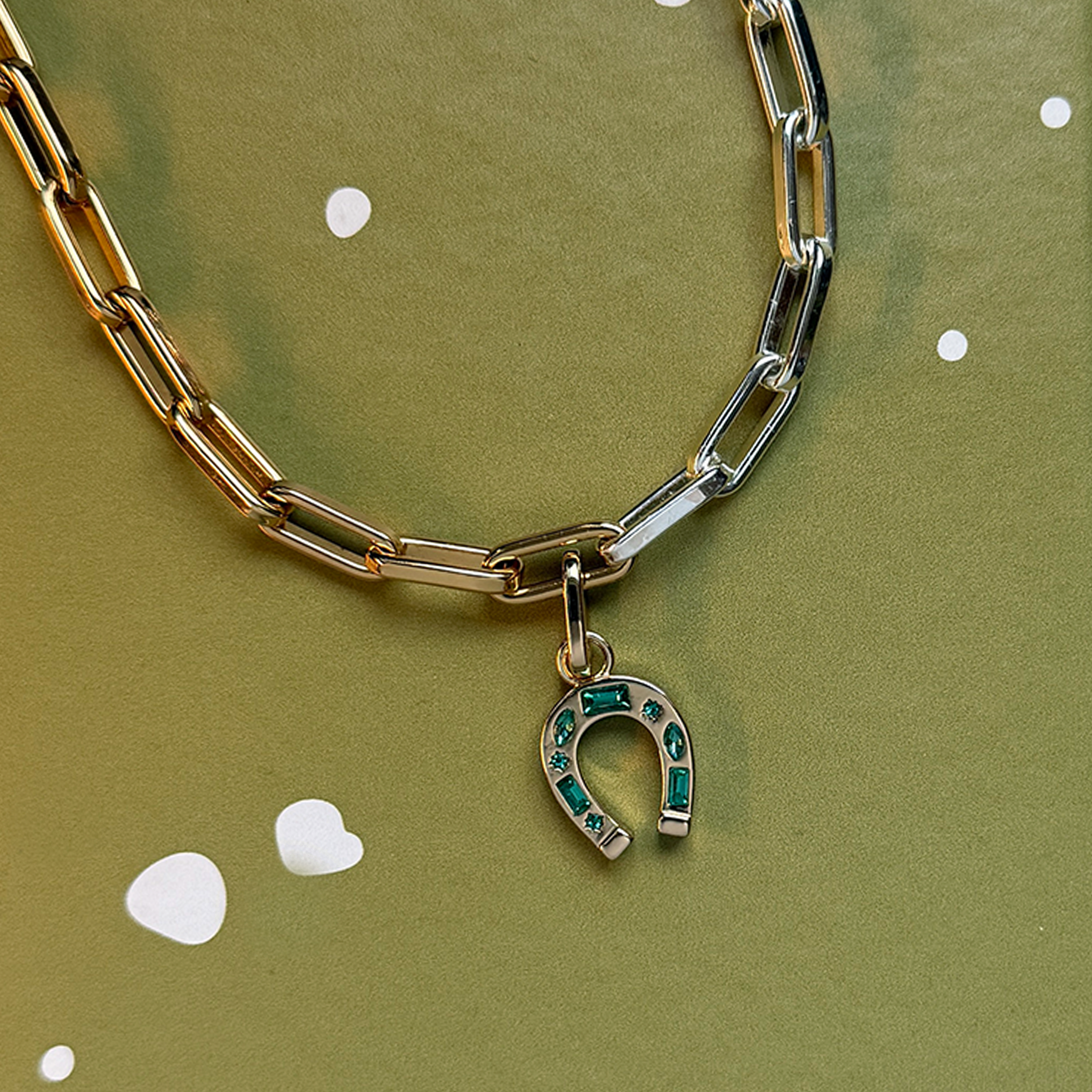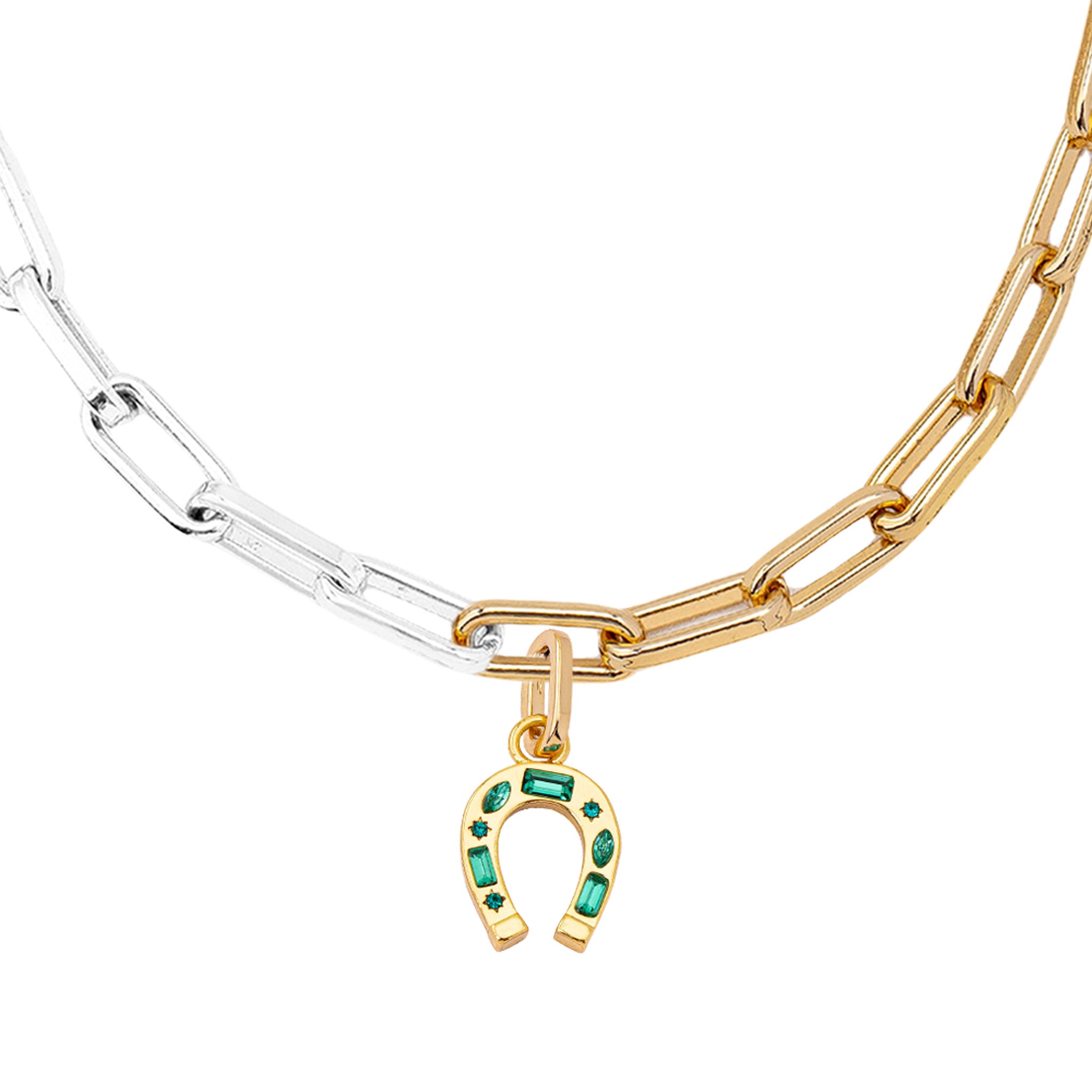 Meet your new good-luck companion. This pre-styled necklace stack features our signature horseshoe charm with green crystals, its the one that blocks out the noise and amplifies all the wins.