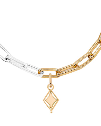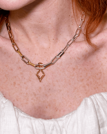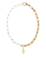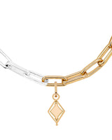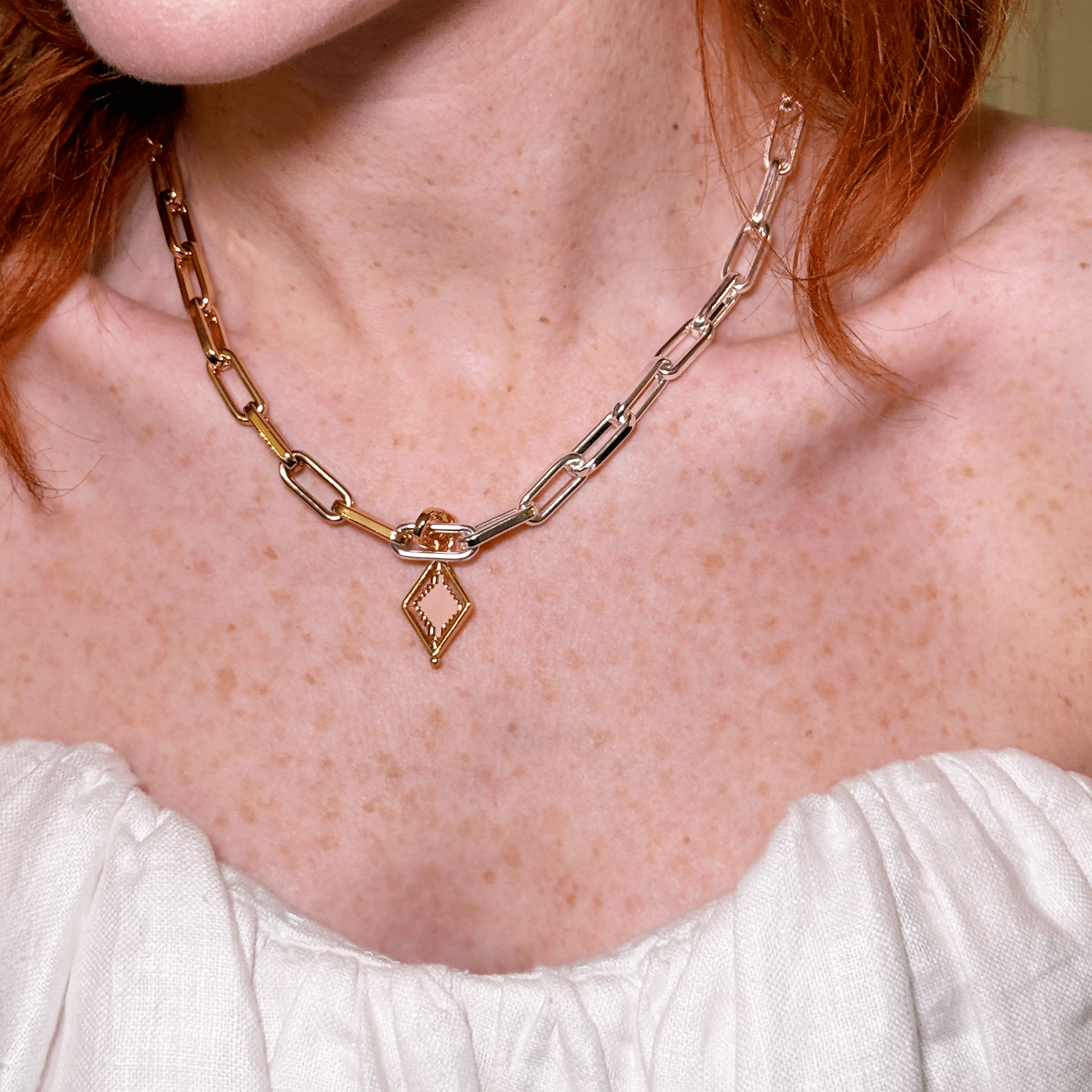Brighten up your look with this playful pixelated spinning diamond necklace stack. Made from mixed metals, each necklace boasts a twirling diamond that sparkles as it moves.
