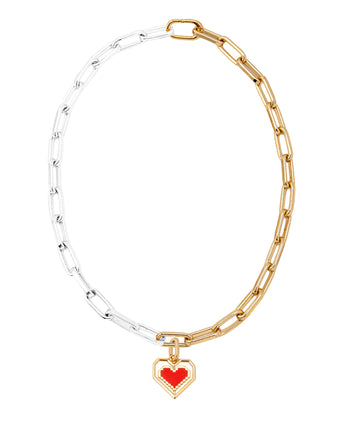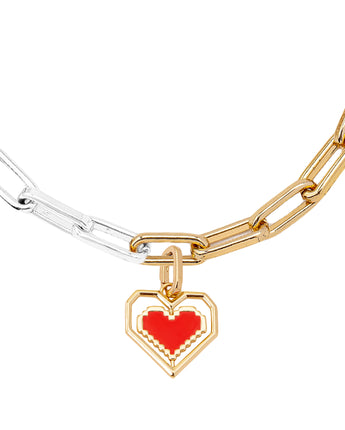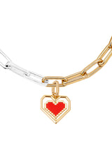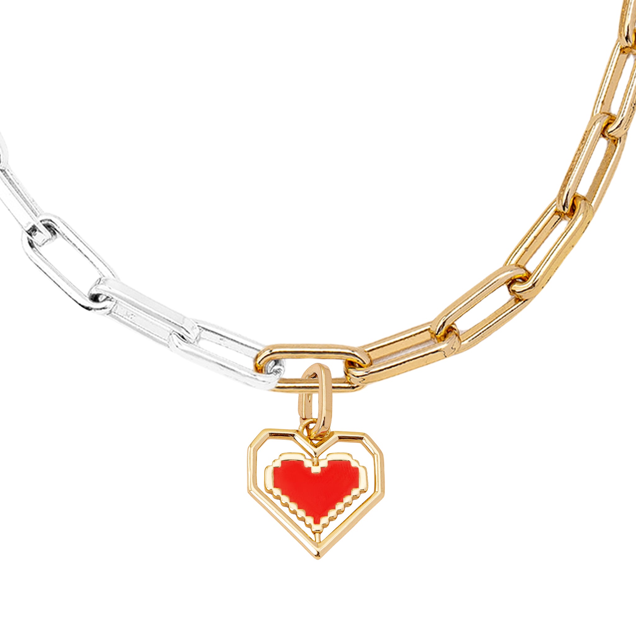 Elevate your style with the pixelated spinning heart mixed metal mega necklace stack. This fun necklace combines the quirky pixelated heart with the bold mixed metal mega for an instant statement necklace.
