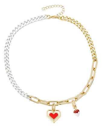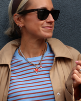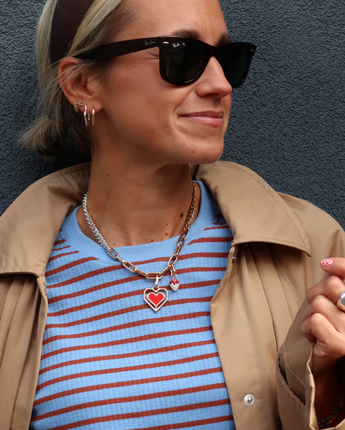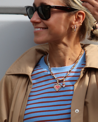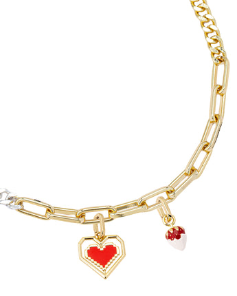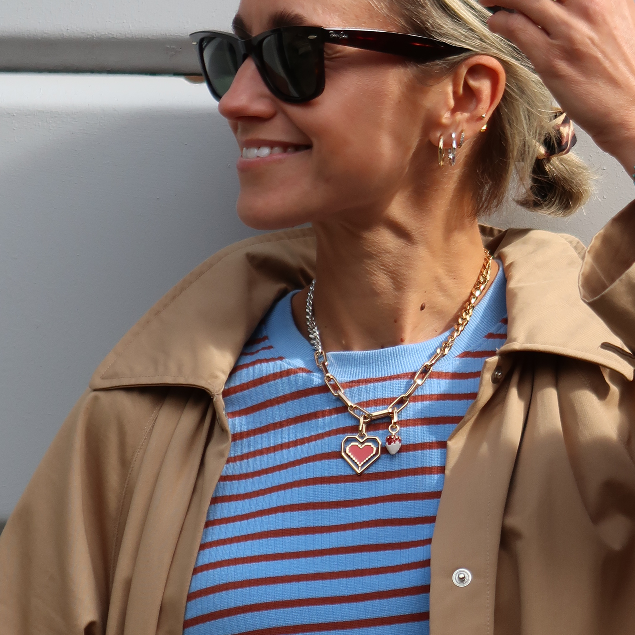 Charlotte’s styles our Link Up mixed metal necklace together with the iconic pixelated spinning heart and an adorable strawberry charm. Perfect for layering or wearing solo, these fun pieces add a whimsical touch to any outfit. Plus, save up to 20% when buying pre-styled stack!